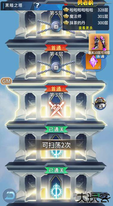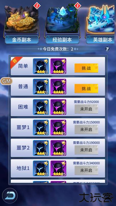 每天有2次免费挑战次数,挑战可获大量英雄碎片,挑战的难度越高,经验越多。