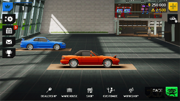 1、在游戏主页,可以选择给车辆改装,换色,购买新车等等,点击race即可开始赛车
