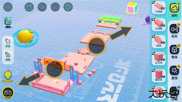 【地形组件】作为地图基础模块,可通过单指拖拽放置到场景中。选中组件后,底部操作栏支持移动、缩放及旋转功能(初始地形组件同样适用)。左侧还设有复制按钮,方便快速生成相同组件。