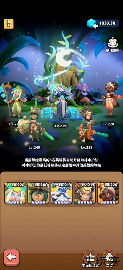 这地方是用来把强力卡牌升到更高级别的。有时候啊,玩到一定阶段,英雄的等级和星星数量就到头了,升不上去了。这时候呢,就得挑手上等级和星星数最高的五个英雄,放到神木祭坛里当 “护法”。等护法仪式结束,这个等级上限就被冲破了!而且吧,你队伍里所有其他的英雄,都能跟着提升等级了,最高能达到那五个护法英雄里等级最低的那位。这样大家的等级天花板都变高了