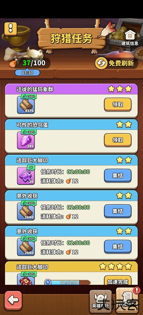2、部落经营中需要亲自砍树、打猎收集木头等资源,优先盖起大本营和酒馆,升级建筑能解锁锻造装备等新能力。