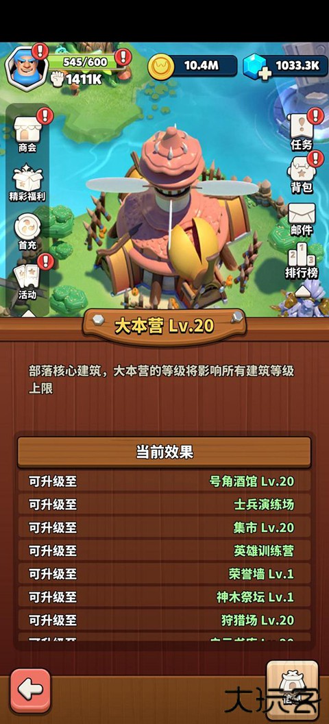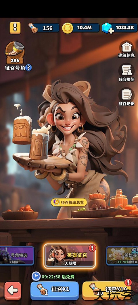 2、部落发展讲究节奏:先把大本营升满级才能解锁其他建筑上限,酒馆抽卡分日常池 / 活动卡池 / 自选招募三种模式。
