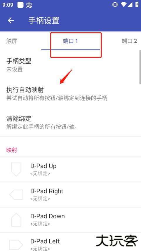 3、接着在“手柄设置”上方导航栏中选中端口 1选项,并在打开的界面中执行自动映射或手动设置手柄按键映射