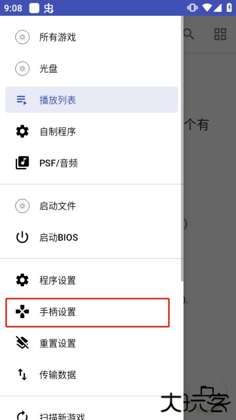 2、接着打开的侧边栏菜单中点击“手柄设置”选项