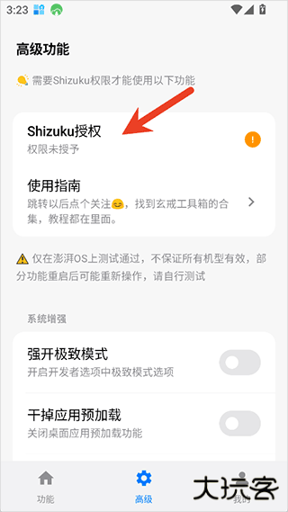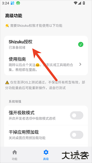 3、一些高级功能就要用户到Shizuku进行授权,拿到adb调试权限进行使用了,授权方式也很简单,你可以直接在玄戒工具箱的高级界面点击Shizuku授权即可