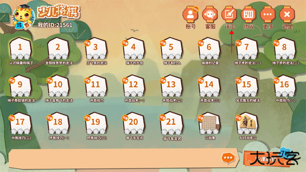 1、打开少儿将棋教学集合,进入到软件主页面,点击右上方的“评论”按钮。
