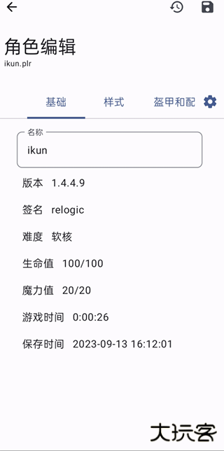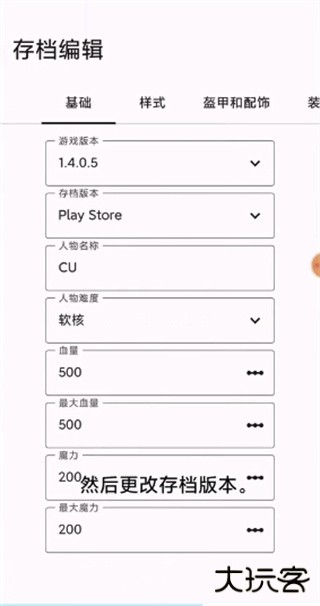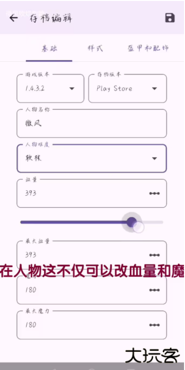 10、进入基础界面,可进行游戏版本、人物名称、难度、血量、魔力等数据的修改,