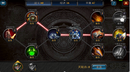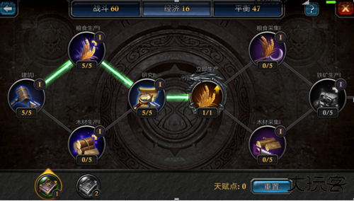 平衡天赋的加点,平衡天赋在发展过程中起着很大作用,因为它在发育时对各个建筑的属性加成包括医院容量、训练速度和其他很多地方都有加速和提升。这个加点也建议全部往后面加。加点稍微复杂的就是战斗天赋的加成,另外一点大家记得注意使用天赋技能,比如使用立即生产立马从城里田中收取五小时采集量,使用三秒回兵坑打你的人这些都是很实用的技能。
