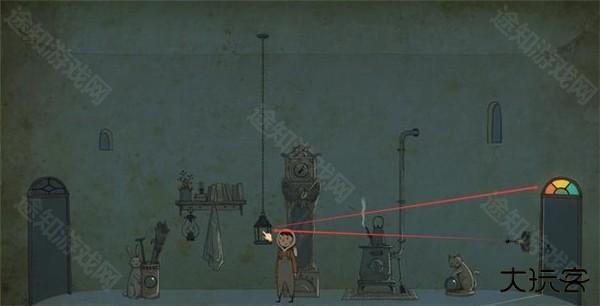 拉动右侧墙体上摇杆使房间内的吊灯下落,熄灭吊灯可获得线索。