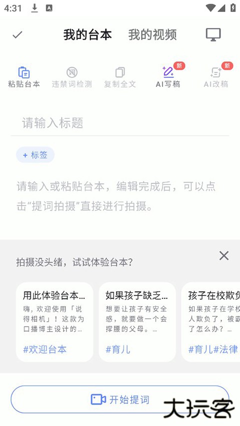 3、新建台本后,用户需要输入视频所需要的台本内容以及自己定义标题。