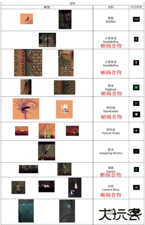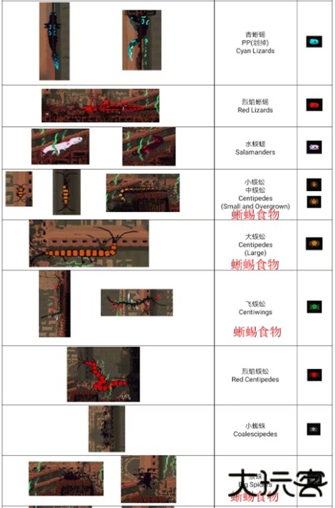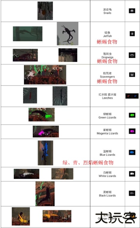 烈焰蜥蜴(BOSS生物):所有蜥蜴的进化终点!会爬管子,会吐粘液,粘液没有伤害但是会减缓移速并把猎物从高处打下来。唯一追着秃鹫咬的恐怖蜥蜴(包括魔王鹫),石头无法击晕它,不想养就跑路。最难养的蜥蜴,而且有些地图没法它跟着走。经过测试似乎烈焰并不吃蓝蜥蜴