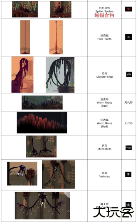 秃鹫&魔王秃鹫(BOSS生物):面具十分有用,想办法引到它跑不掉的地方鲨,近身拔插压根咬不到你;魔王鹫可以通过秃鹫进化,多了一个射击长矛的能力,有红线以及声音提醒,除此之外和普通秃鹫一样。