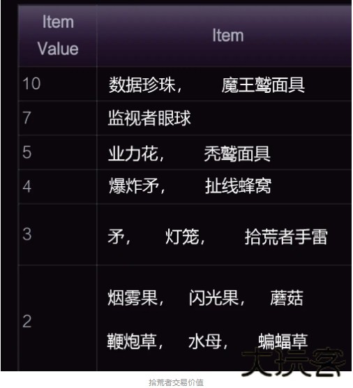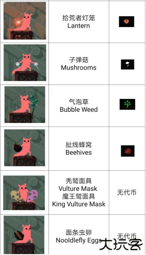秃鹫&魔王鹫面具:吓跑蜥蜴,但是一旦被发现不是秃鹫就无效了(?),魔王鹫面具效果更好。可以给拾荒,魔王鹫面具更有价值。