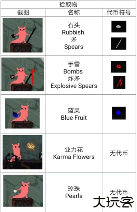 石头与矛:随处可见的物品。石头不会造成伤害但是会对生物产生硬直,对蜥蜴可以把头打转向;矛则是最基础的攻击方式,也会造成一定的硬直。