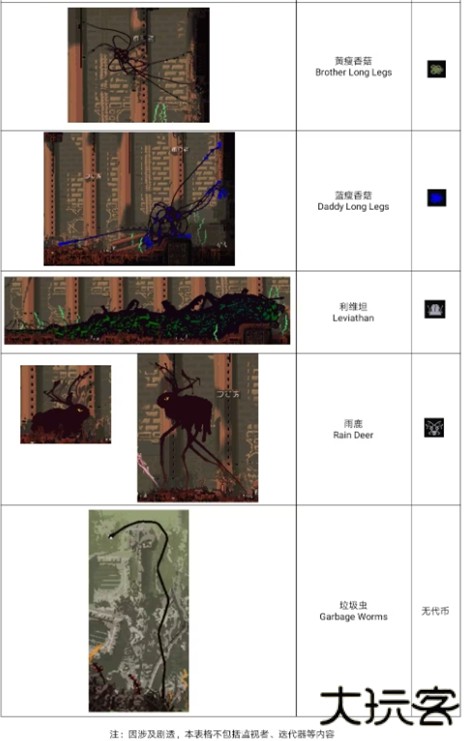 小面条虫&大面条虫:小的能吃,但是大的会追杀你一辈子。会鲨大的就天天吃肉,大的在管道里不会攻击(但是会堵路),建议在狭小的地方打,如果插中建筑会要一段时间拔出来。
