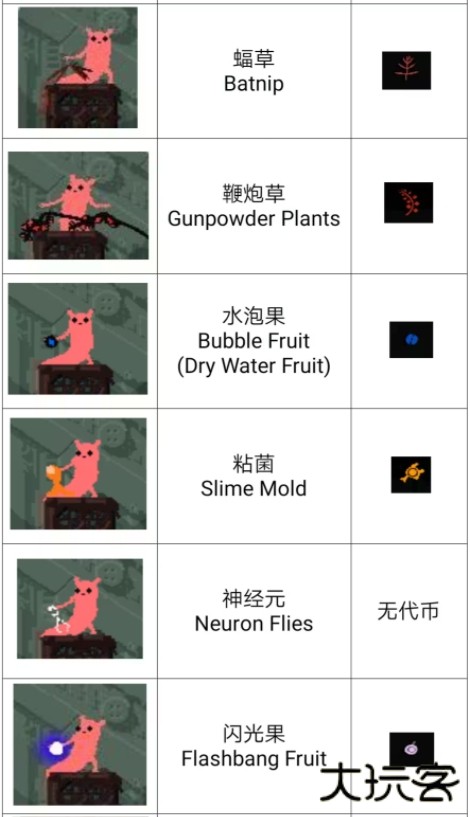 烟雾果:杀虫剂,可以一击必杀蜈蚣以及蜘蛛(持续性伤害,不会马上死);呼唤雨鹿或给雨鹿喂食。可以给拾荒。