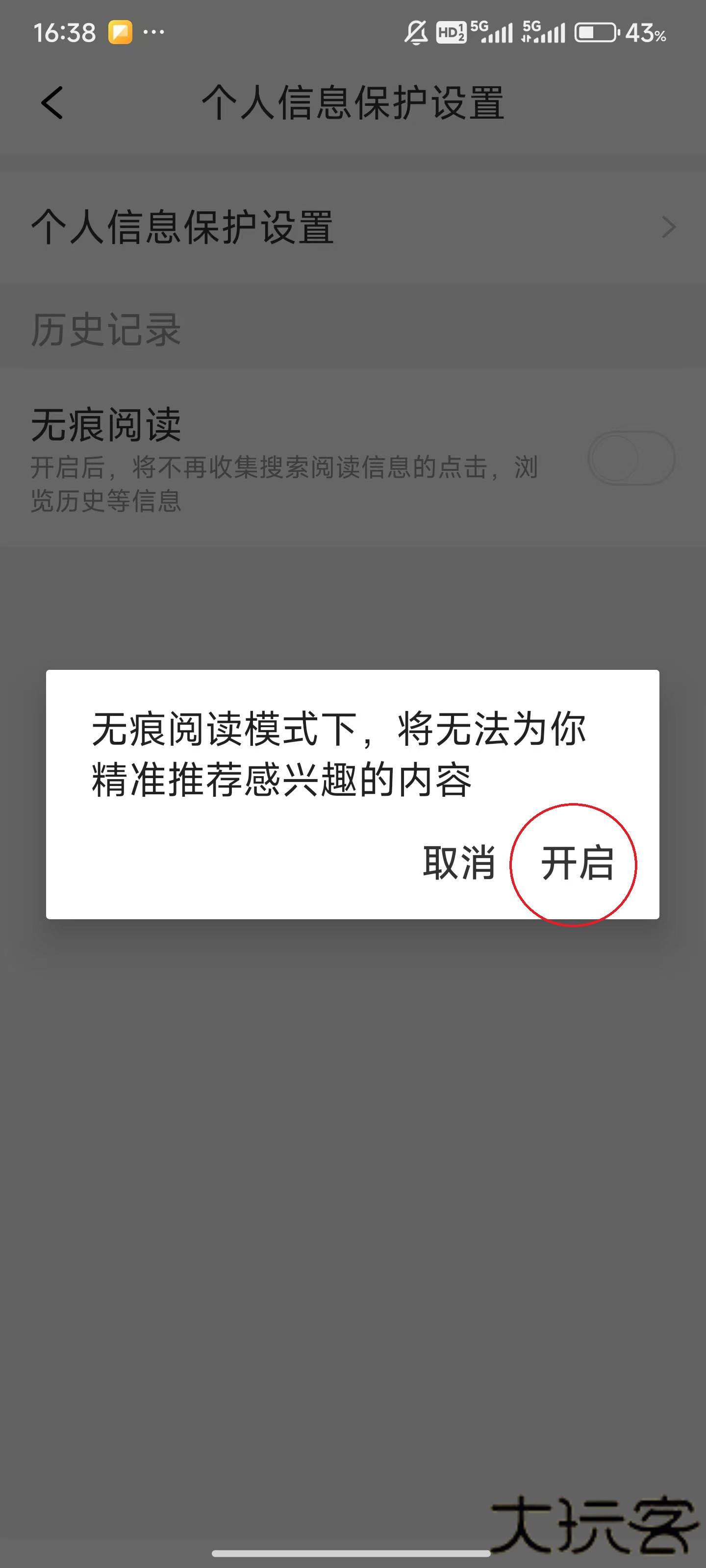 5、点击弹窗右下方的【开启】,这样就开启无痕阅读了。