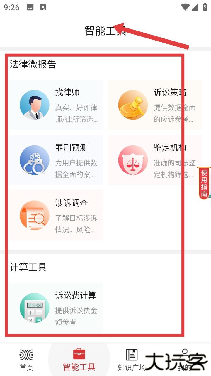 2、智能工具页面划分法律微报告与计算工具,微报告涵盖找律师、诉讼策略等服务,助力筛选律所、预判罪刑,计算工具提供诉讼费计算。