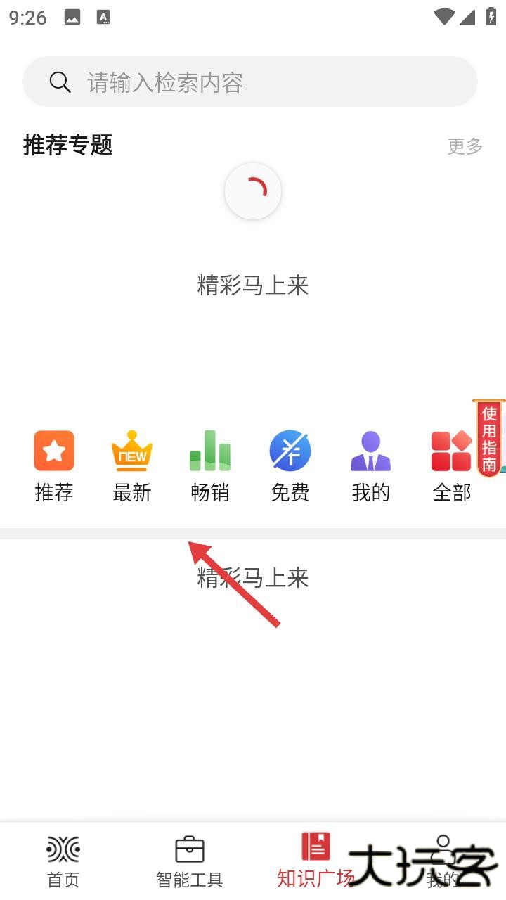 3、知识广场页面设搜索栏,可检索法律内容,下方推荐专题推荐专题待加载,分类栏含推荐、最新、畅销等标签,界面简洁直观。