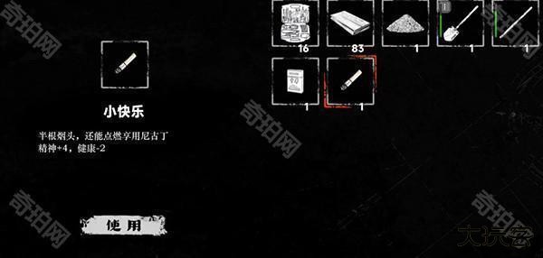 1、烟头:探索翻垃圾或者击败敌人获得,使用后可以获得精神点,但会减少健康值。