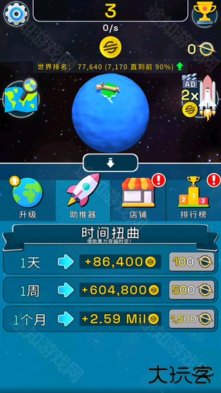 3、第二栏为助推器,其功能就是借助重力穿越时空,分别可以穿越一天、一周以及一个月,而使用助推器需要耗费大量的星球币,