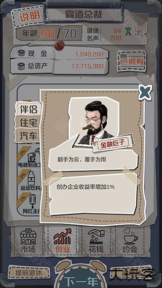 13、【金融巨子】被动属性:创办企业收益率增加1%触发条件:约会圣地有几率遇解锁条件:名声大于或等于200