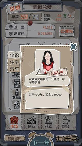 一亿小目标是一个特色格外新潮的打理类游戏著作!一亿小目标引入了全新的游戏类型元素,相信只要您一开启玩一亿小目标,就会难以停止!《一亿小目标》是一款文字类的模拟经营手游,新颖的玩法,内容还算丰富,更有简便的操作方式,还有不同的触发事件等你来体验,喜欢的玩家赶紧下载,打造你的商业帝国吧!此外,为了使游戏中的模拟人生变得更加真实,一亿小目标还特别添加了伴侣功能,只要玩家选择与某位NPC结为伴侣,就可以发展自己的家庭,共同养育子女。