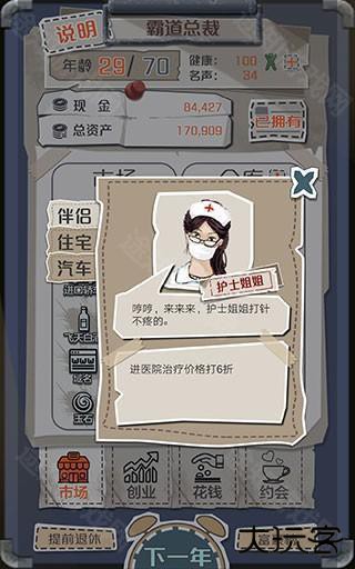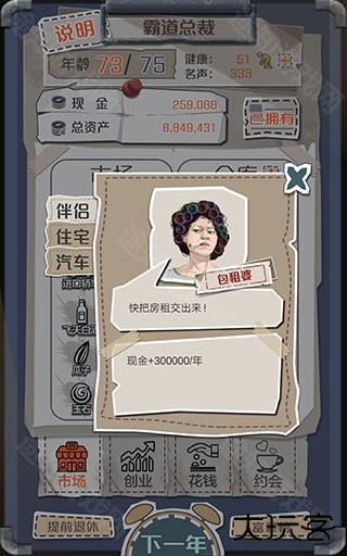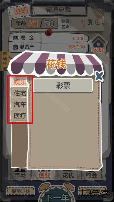 6、除了做生意投资之外,游戏中还有其他需要花钱的地方,比如娱乐、住宅、医疗等;
