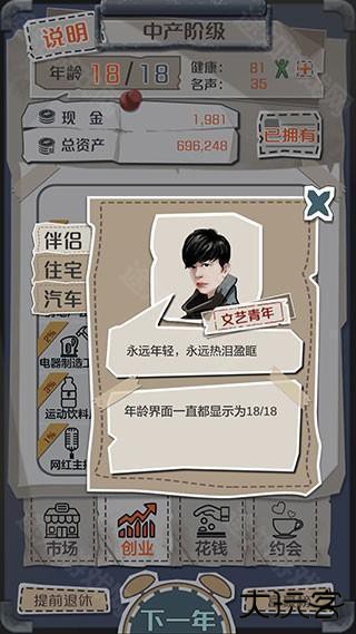 11、【文艺青年】被动属性:界面显示十八岁,但还是会老触发条件:约会圣地有几率遇解锁条件:目前现金不能超过1万