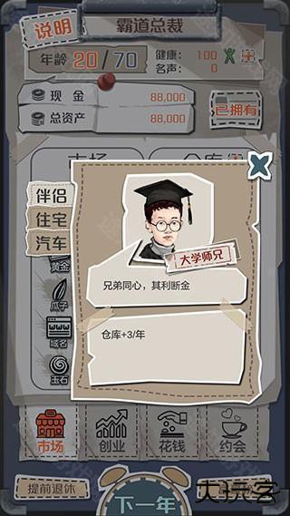 2、【大学师兄】被动属性:每年仓库增加三格触发条件:初始随机生成,约会有几率遇解锁条件:年龄低于25