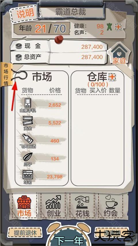 2、创业:创办公司时需要大笔投资,后期可追加或减少投入,公司会涨跌,可获取盈利;