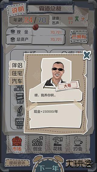 10、【大哥】被动属性:每年增加十五万现金触发条件:约会圣地有几率遇解锁条件:年龄低于30