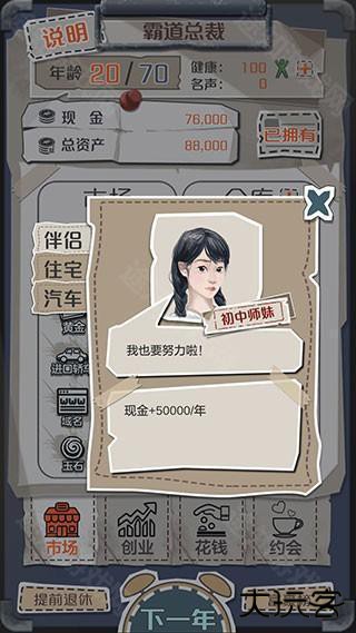 7、玩家在投资赚钱之后可邀请小学同桌和班花进行约会,提升好感度。