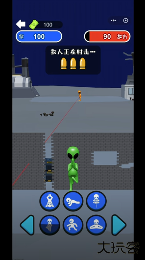 你狙我躲狙击外星人是一款抖音热门游戏,对战版,玩家可以选择不同的武器,和动作,开启狙击对战。玩家需要通过自己的身法,多个动作来躲避敌人的子弹,三颗子弹躲避完成,就可以进行下一个回合。如果打中敌人没有爆头,那么将进入到下一个回合。掩体不会恢复,在多个回合会越来越少。