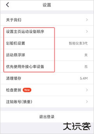 3、设置功能,用户可以在该页面中对设置主页运动设备顺序、划船机设置、运动悬浮球、优先使用外接心率设备四大内容根据自己需求进行设置。