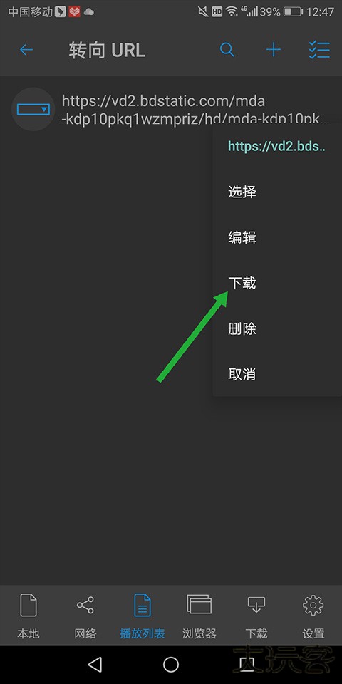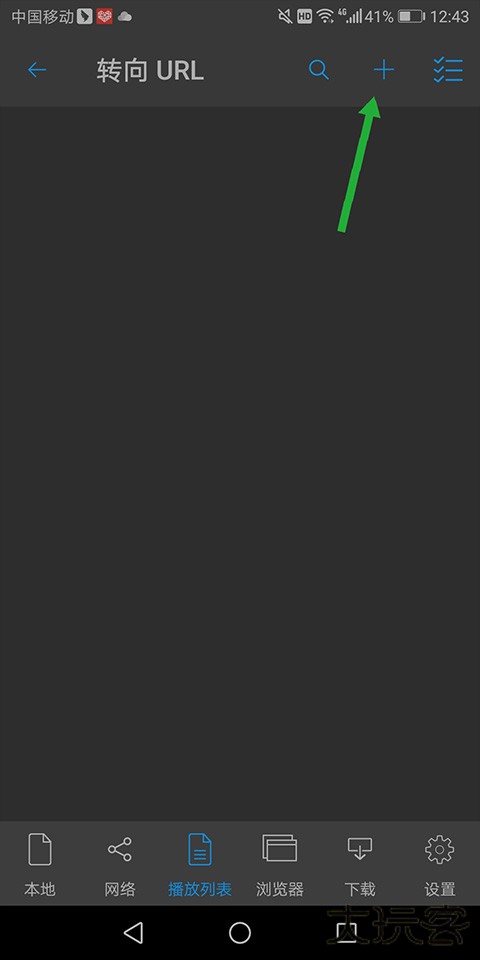 1、在打开的nplayer pro安卓版页面中点击底部【播放列表】进入新页面后点击页面上部的【+】(下图绿色箭头所指区域)