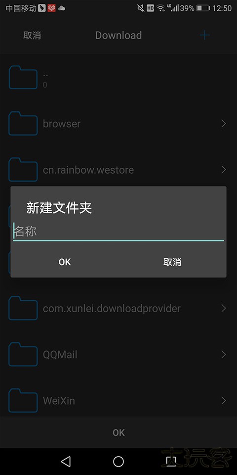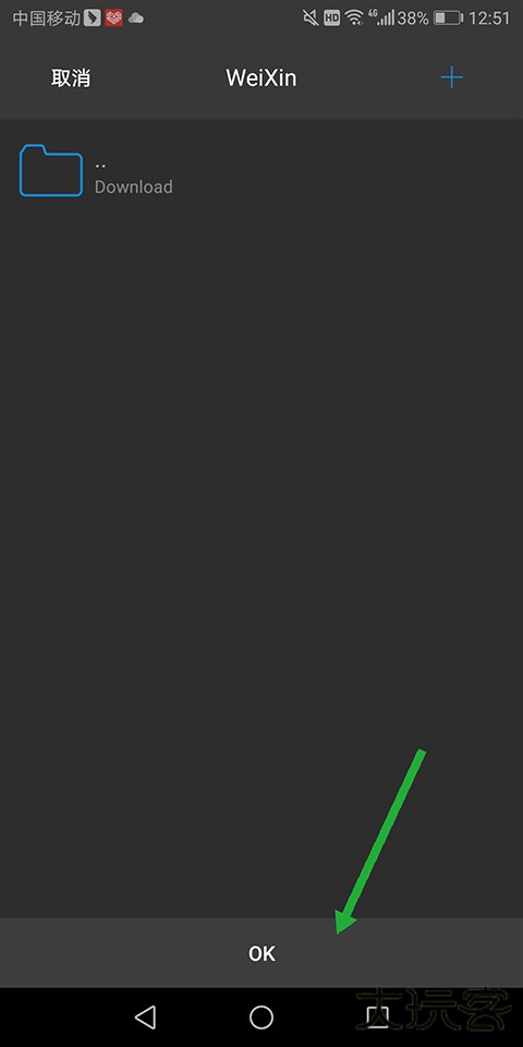 5、在弹出的页面中选择下载到手机上的具体文件目录下,也可点击右上角的【+】进行新建文件夹目录