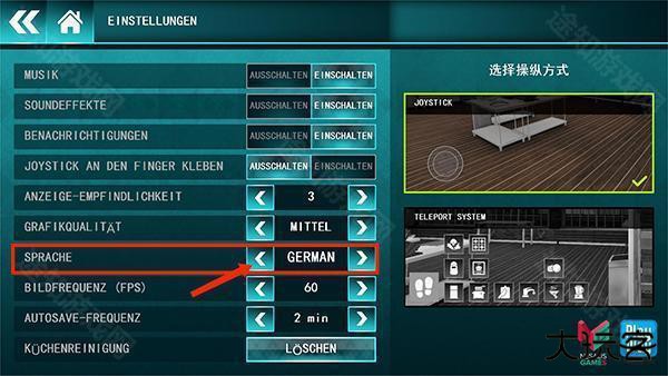 2、进入设置界面,选择SPRACHE(倒数第四行)的【三角形】图标进行语音切换,