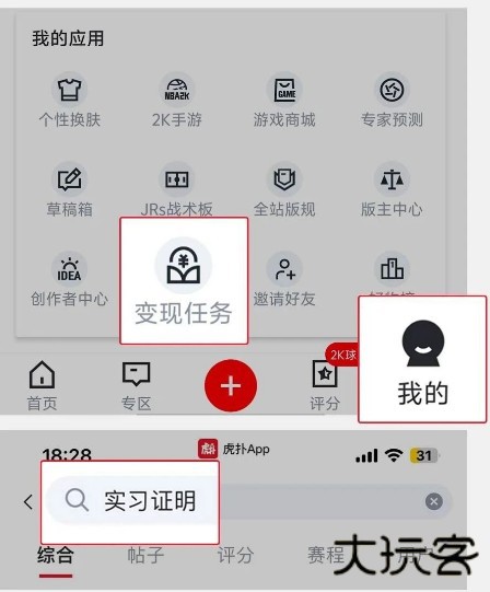 1、打开软件,点击【我的】-【变现任务】或者在虎扑App搜索【证明】