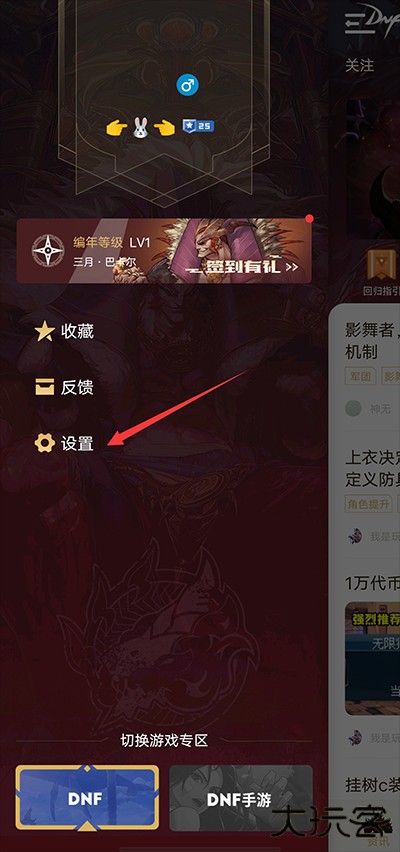 1、打开dnf官方助手APP后,点击左上角设置选项(三横图标),进入设置界面