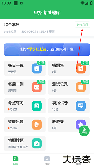 1、下载并打开上学吧单招考试题库,在首页点击右上角的【切换科目】进行科目的切换