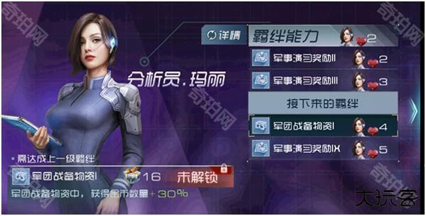 由于礼物不够不能解锁下面的羁绊,请各位看官自行脑补,里面5个进阶分别是军事演练1-4,军团物资1级,基本也就是军事演练里面各项奖励增加30%,军团各项奖励50%,解锁度要求高,建议礼物充足后再解锁。