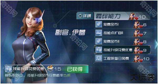 先来说副官伊蕾里面10个进阶分别是战役金币I、战斗加速、能量仓扩建、战役金币II、技能点扩容I、免费金币I、技能点扩容II、免费金币II、技能升级花费优惠、工程院每日免费,这10项进阶都必须点开。