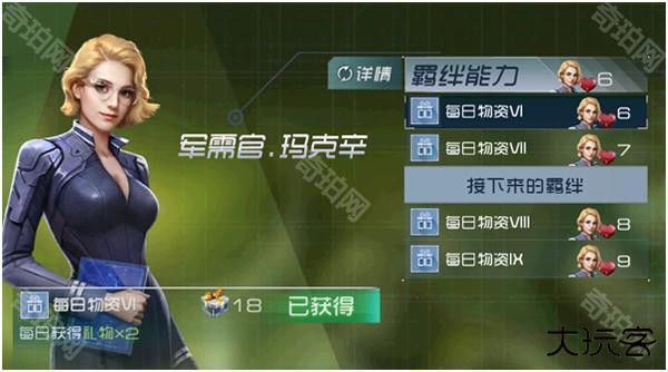 军需官玛克辛里面10个进阶分别是每日物资I、每日物资II、每日物资III、每日物资IV、每日物资V、每日物资VI、每日物资VII、每日物资VIII、每日物资IX、每日物资X。其中里面每日物资VI是每日获得礼物2,这个是整个指挥部第一必要先升级的指标!其他里面送的东西都是一些普通的必需品例如战舰图纸配件进阶箱子等等,我就不在累赘。