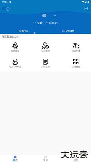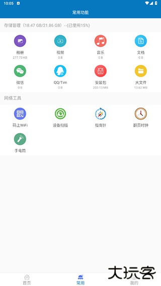 点击屏幕底部的“常用”选项,即可进入常用功能页面。该页面包含存储管理和网络工具两大模块,内置丰富的小功能。