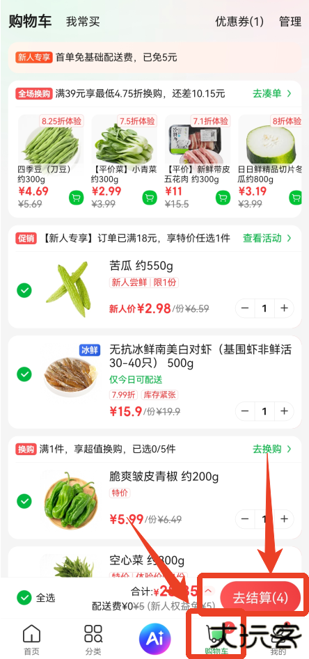 2、挑选完成之后,点击下方第三个购物车按钮,可以看到刚刚加入的商品,点击右下角的去结算,需要达到一定的金额的开始配送。