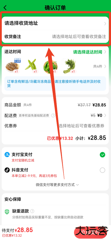 3、在最上方选择收获地址,还能备注需求,比如放在家门口什么的。