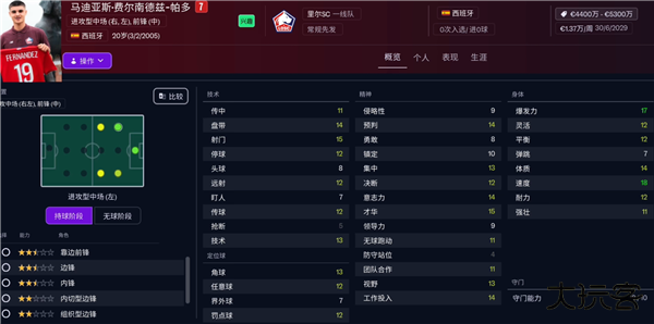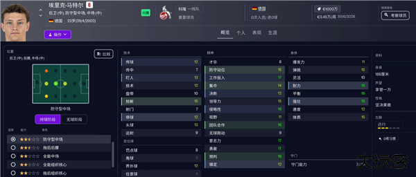 意志栏中意志力、工作投入和团队合作都是顶级,体质和耐力拉满,天生的B to B圣体,首推中前卫位置上的全能中场。