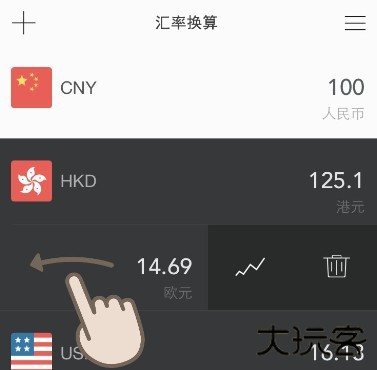 5、更多选项在货币列表上向左滑动可查看历史汇率或删除货币