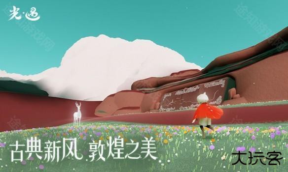 5、从平台向下飞去,在神庙入口的左侧,有一个山洞,必须收集前两个先祖才可以进入,在里面可以得到第三个先祖——拒绝动作先祖。右侧还可以穿过云洞,到达一个石门处,启动机关飞向高出的山洞,洞内有第五个光翼。